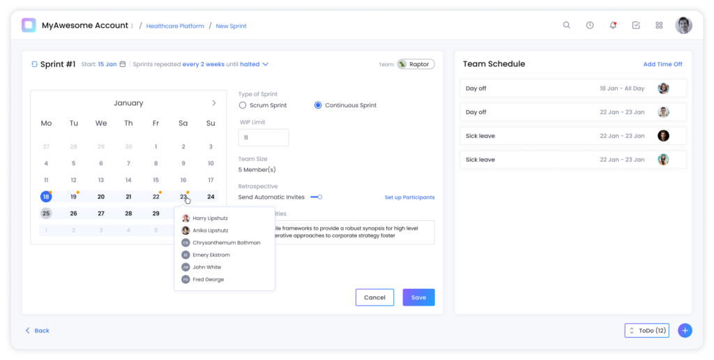 Our users always appreciated New Sprint capacity calculations. We separated Time Off schedules on New Sprint page to provide better visibility and also updated the calculation so that its based only on Dev, QA, and UI/UX team members.