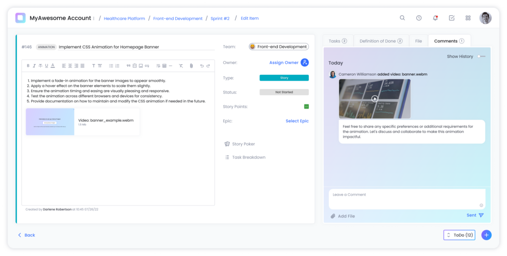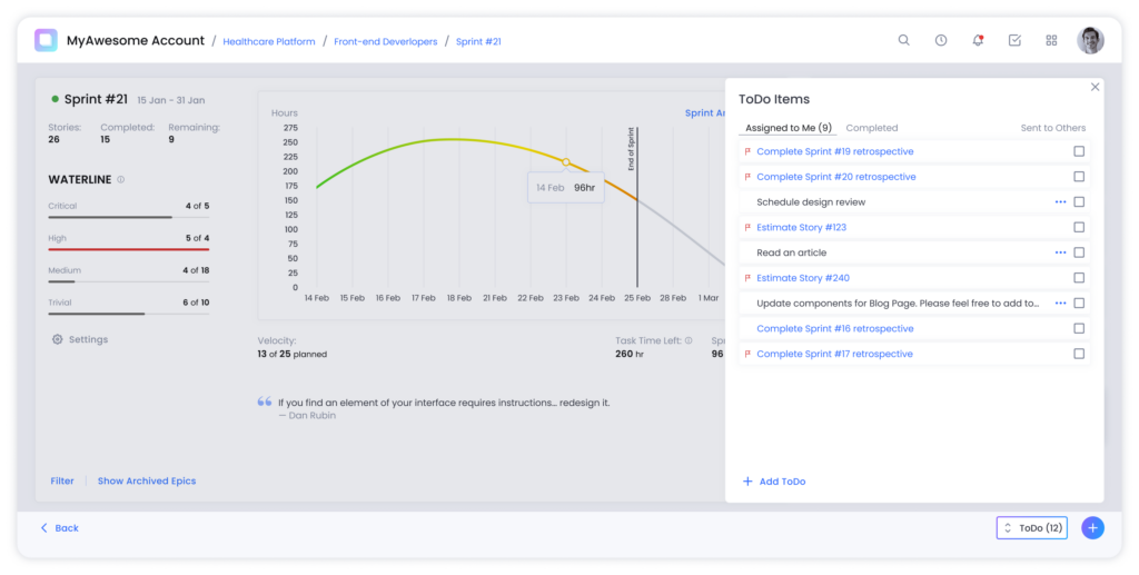 We expanded the ToDos to make it easier to track work outside of Sprints. ToDos are automatically assigned by the system for Retrospectives, can be triggered to request Story Estimation and Decomposition, and now provides a better way to assign ToDo’s to other Team Members.